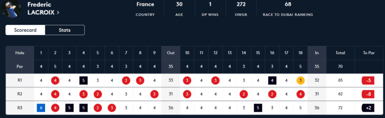 Dix-septième à -11, la tâche s’annonce bien plus compliquée désormais pour Frédéric Lacroix, le grand perdant de ce 3e tour. Co-leader à mi-parcours grâce notamment à un magnifique 62 (-8) vendredi, l’autre racingman est passé à côté de sa journée avec notamment un double bogey dès le trou n°1. Alternant le bon et le moins bon, il n’a pu faire mieux qu’un 72 (+2). C’est la seule carte au-dessus du par parmi les 33 premiers au leaderboard !