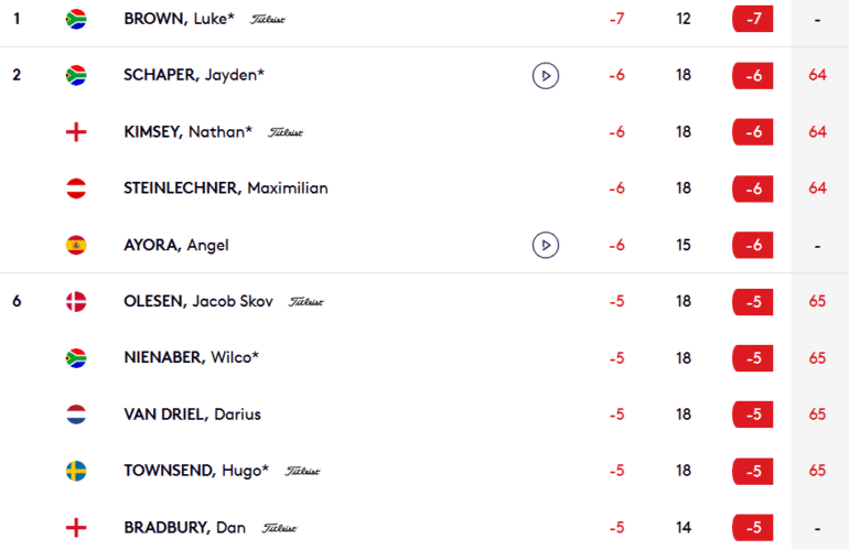 Alors que le Sud-Africain Luke Brown est virtuellement leader à -7 après 12 trous joués (parti du 10), c’est son compatriote Jayden Schaper qui est en tête au club-house avec une carte de 64 (-6) sans bogey. L’actuel n°2 de la Race to Dubaï continue de surfer sur cette vague du succès, lui qui a déjà remporté deux tournois cette saison sur le DP World Tour : l’Alfred Dunhill Championship et l’AfrAsia Bank Mauritius Open.