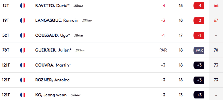 En tête à -6 au départ de son dernier trou (le par 3 du 9), David Ravetto n’a pu faire mieux qu’un… double bogey ! Le Racingman recule provisoirement à la 12e place à -4 (66) mais dirige néanmoins le contingent tricolore juste devant Romain Langasque (19e à -3). Dans le dur pour cette entame perturbée par les éléments, Martin Couvra doit se contenter d’un difficile 73 (+3) et d’une déjà très inconfortable 121e place, tout comme Antoine Rozner.