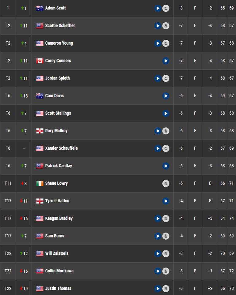 Xander Schauffele a rentré une approche d’une cinquantaine de mètres pour un eagle au 17 et un score de -6 qui lui permet de rejoindre Rory McIlroy au sixième rang. Les deux hommes ont d’ailleurs assuré le spectacle en fin de journée ! Avec son premier tour de golf sans aucun birdie en 2022, Justin Thomas se contente de la 22e place à -3. Leader après le premier tour, Keegan Bradley a joué dix coups de plus que la veille (17e, -4).