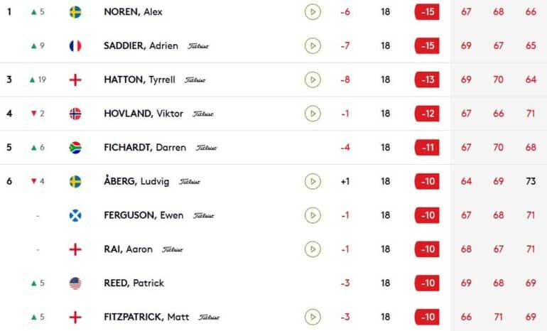 Les deux leaders auront à leurs trousses deux très gros gibiers : Tyrrell Hatton (qui partagera la dernière partie) et Viktor Hovland. Le premier, 64 (-8) dans ce 3e tour, est en mode « Remontada » après deux premiers tours poussifs (69 et 70). Le second, très entreprenant jeudi et vendredi, a montré quelques signes de faiblesses ce samedi à l’image de son 71 (-1) lesté par un double et deux bogeys notamment. L’Anglais du LIV Golf, victorieux ici même en… octobre 2020 en pleine crise du Covid devant Victor Perez, est seul troisième à deux coups. Le Norvégien, pourtant leader à -14 après sept trous joués, occupe la 4e place, à trois coups derrière…