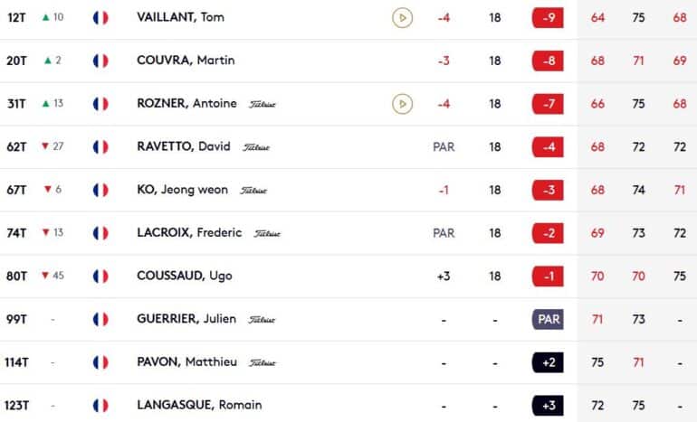 A noter qu’un second cut est intervenu ce samedi soir afin de réduire le champ à 67 joueurs et ex aequo. Et celui-ci a été fatal à Frédéric Lacroix (74e à -2) et à Ugo Coussaud (80e à -1). Mais aussi à l’Ecossais Robert MacIntyre, en petite forme cette semaine en Angleterre. Pas franchement rassurant à deux semaines de la 45e Ryder Cup de l’histoire !