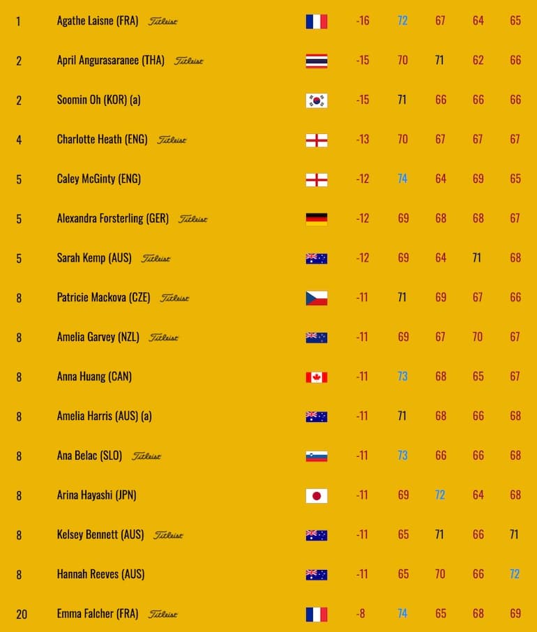À égalité avec sa compatriote après le deuxième tour, Emma Falcher a bouclé le tournoi à la 20e place après avoir signé un 69 (-2).