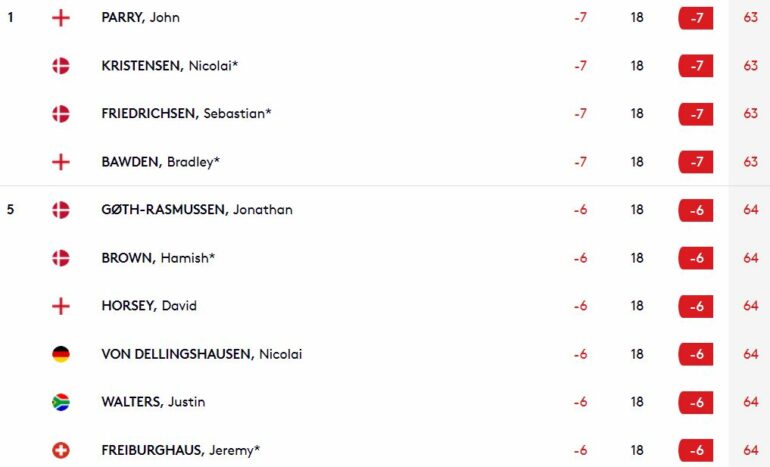 Huit hommes suivent à -6 (64) dont l’Allemand membre du DP World Tour, Nicolai Von Dellingshausen, mais aussi les vétérans David Horsey et Justin Walters, respectivement 39 et 43 ans.