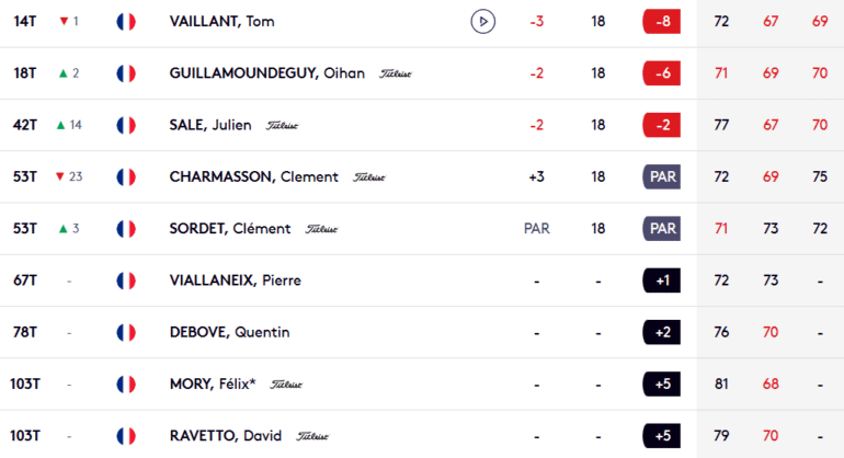 Outre Alexander Levy, certains autres golfeurs tricolores ont été eux aussi très actifs ce samedi à Maurice. On pense ici à Tom Vaillant, 14e à -8 (208) après avoir posté un bon 69 (-3), et à Oihan Guillamoundeguy, ultra sérieux en 18e position à -6 (210) avec son 70 (-2).