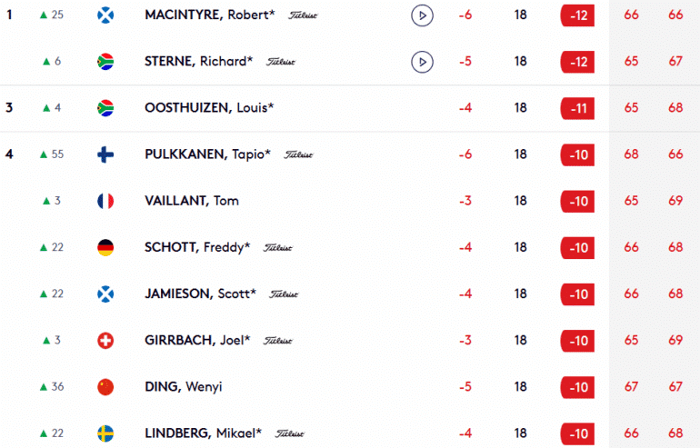Pour espérer rentrer relativement au sec avant le déluge, il fallait donc hériter d’un tee time matinal. C’est ce qui a permis au Sud-Africain Richard Sterne et à l’Ecossais Robert MacIntyre de pointer provisoirement en tête à -12 (132) avec respectivement des cartes de 67 (-5) et 66 (-6).