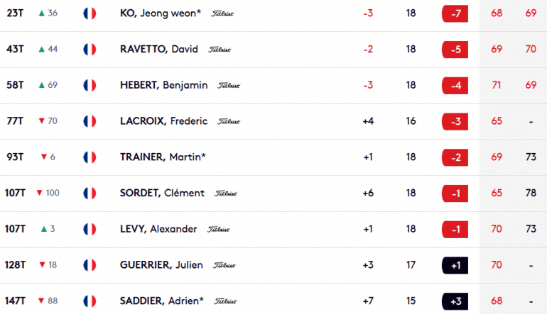 Derrière lui, il faut aller au-delà du top 20 pour trouver Jeong weon Ko (23e à -7) et plus loin encore David Ravetto (43e à -5).
