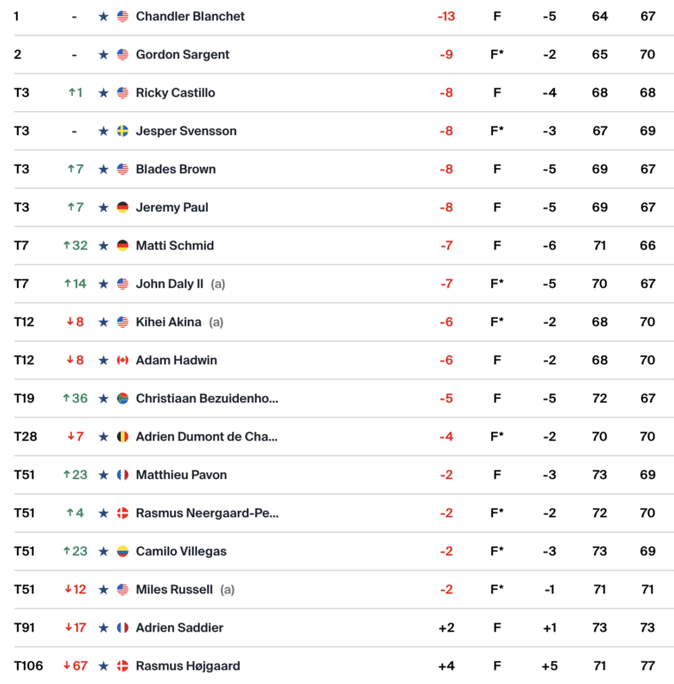 Un homme caracole en tête du Puerto Rico Open après deux tours, l’Américain Chandler Blanchet, qui s’est octroyé quatre coups d’avance sur son plus proche poursuivant, Gordon Sargent. Matthieu Pavon a bien réagi après une première journée délicate et s’est assuré le droit de jouer ce week-end. Adrien Saddier a manqué le cut.