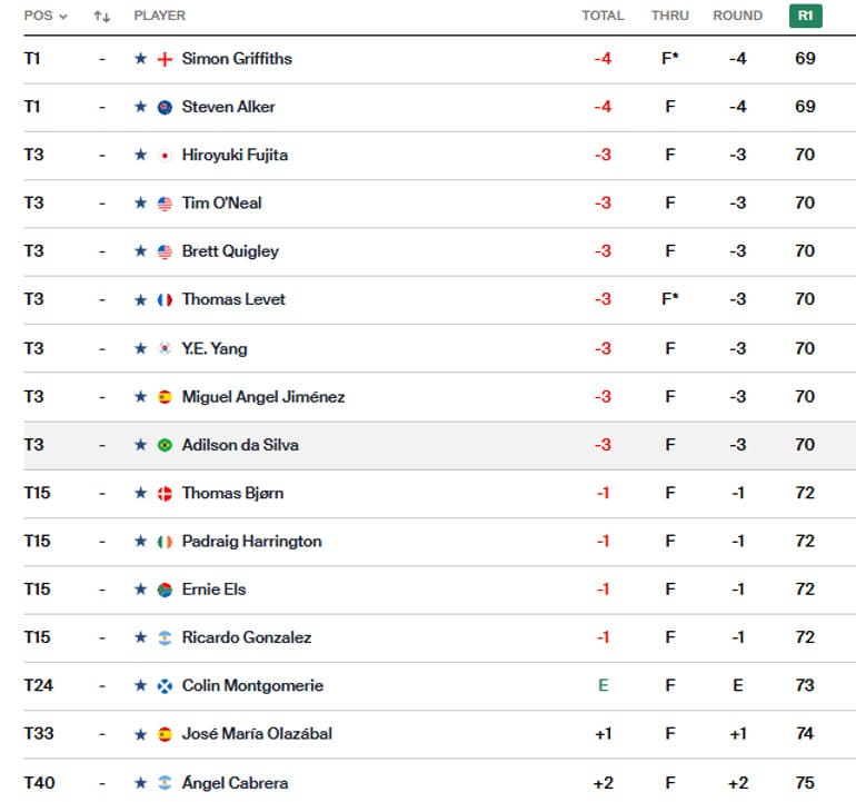 Le fantasque espagnol Miguel Angel Jiménez est sur le podium aux côtés de Thomas Levet. Les stars Ernie Els, Thomas Bjørn, Padraig Harrington et le tenant du titre argentin, Ricardo Gonzalez, sont tous en embuscade à la quinzième place (-1), parmi les 23 joueurs sous le par après 18 trous.