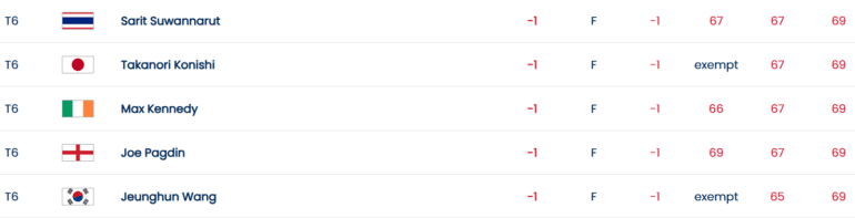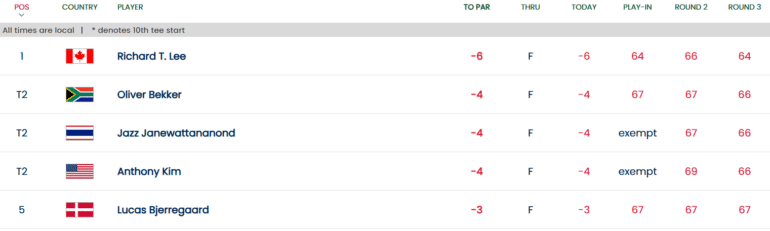 On rappelle que les scores du 3e tour sont conservés pour le 4e et dernier tour ce dimanche. Comme indiqué plus haut, les trois premiers après 36 trous joueront en 2026 sur le LIV Golf alors que le top 10 (et ex aequo) bénéficiera d’une exemption sur les tournois estampillés International Series de l’Asian Tour 2026.