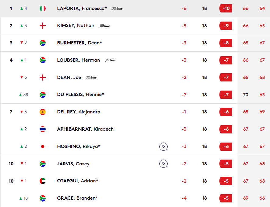 A la même marque, retrouvons le plus Sud-Africain de tous les Français cette semaine. Pierre Viallaneix, joueur de 26 a fait le choix depuis une saison de fréquenter les fairways du Sunshine Tour (le tour Sud-Africain) et profite de ses connaissances locales pour briller sur un tracé que peu de joueurs avaient arpenté auparavant. L’actuel 51e du Ranking Sunshine a distribué 8 birdies sur sa carte de score vendredi, pour rendre un 65 (-5) et remonter 58 places au classement.