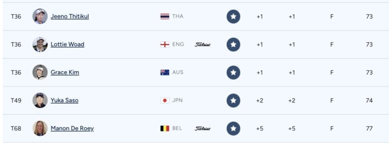 Un peu malade, la Kiwi aux trois titres du grand chelem et médaillée d’or à Paris en 2024 Lydia Ko a réussi à limiter la casse en signant un bon 70. L’Anglaise Charley Hull a débuté avec une carte dans le par, tandis que Jeeno Thitikul épatante dimanche dernier à Pattaya, s’est contentée d’une carte au-dessus de 73 (+1) qui la relègue en milieu de classement à 7 coups de la leader.