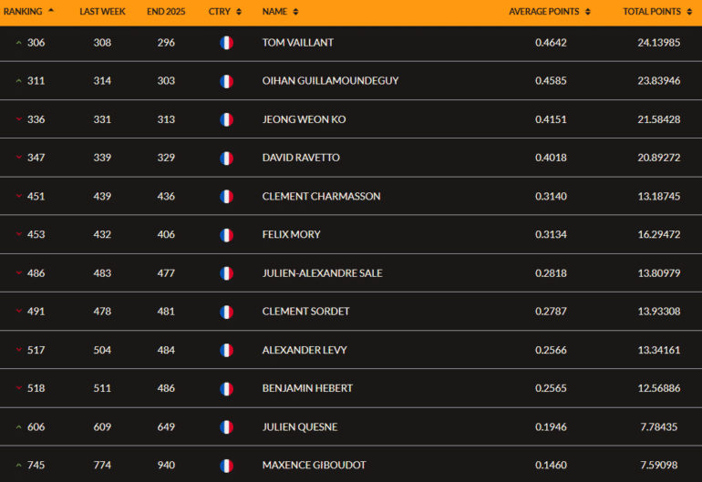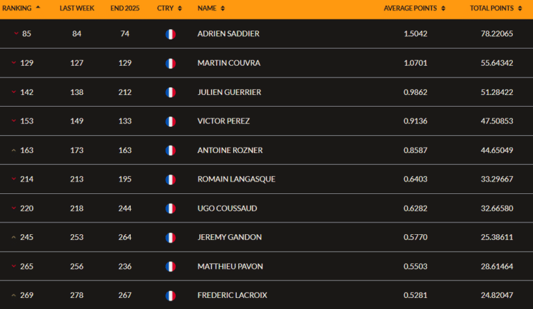 60e au WM Phoenix Open, Adrien Saddier reste toujours au 8 février 2026 le seul tricolore dans le top 100 mondial mais il perd toutefois une place (85e). Il faut ensuite aller bien plus loin au classement pour trouver Martin Couvra, qui n’a pas passé le cut au Qatar (129e, -2). Suivent Julien Guerrier (142e, -4), Victor Perez (153e, -4) et Antoine Rozner, auteur d’un bon top 10 (9e) à Doha. Le Racingman avance en 163e position (+10).