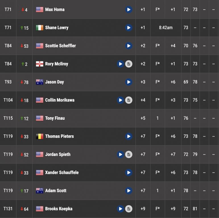 Le numéro 2 mondial Collin Morikawa navigue provisoirement au delà de la 100e place à +4 et le Nord Irlandais est tout juste mieux loti, lui aussi en grand danger de manquer le cut à +3 au 84e rang.