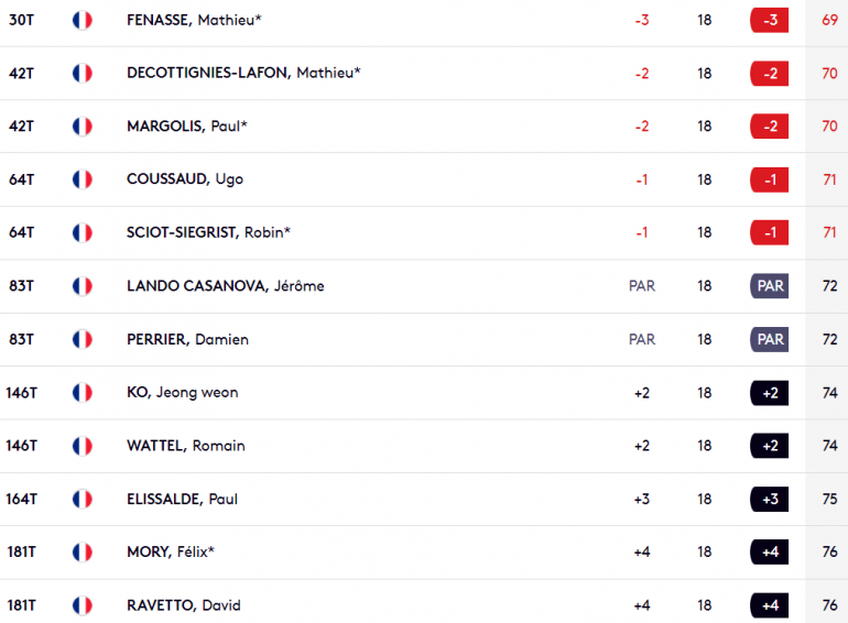 Les quatorze autres français engagés pour cette reprise sur le Challenge Tour après quinze jours de repos sont un peu plus loin au leaderboard. On trouve ainsi Mathieu Fenasse, Clément Berardo et Gary Stal à la 30e place à -3 (69).
