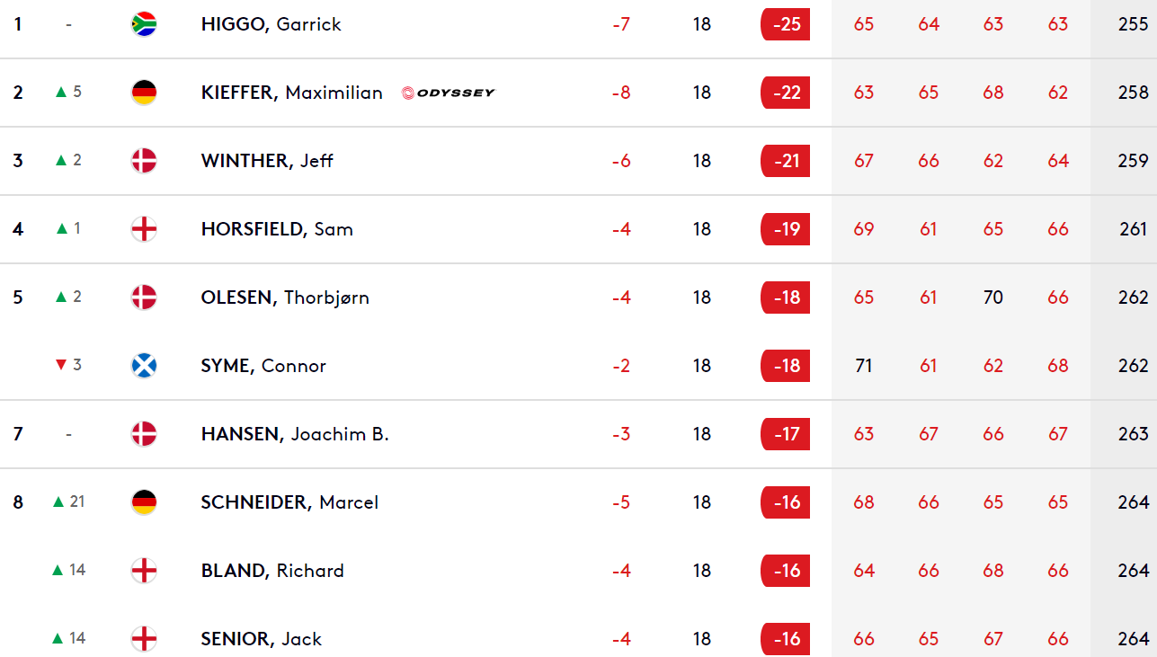 Sans frémir, proposant un jeu de golf d’un très grand niveau, malgré le vent, omniprésent, Higgo l’emporte à -25 (255), soit trois points d’avance sur l’Allemand Maximilian Kieffer. Le Danois Jeff Winther complète le podium à -21. Après l’Open du Portugal en septembre dernier, co-sanctionné avec le Challenge Tour, c’est la seconde victoire en seulement vingt-quatre départs sur l’European Tour du Sud-Africain, gaucher sur les fairways, droitier dans la vie.