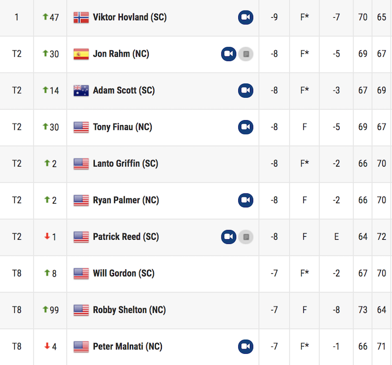 Il restait trois trous au leader de la veille, Patrick Reed, au moment de l’interruption. Lui a signé un bogey sur le 17 immédiatement corrigé par un birdie sur le trou suivant, terminant sa journée dans le par. Le Texan occupe la deuxième place au côté de 6 autres joueurs à un coup du leader. Parmi les dauphins, on retrouve Jon Rahm et Tony Finau qui ont su ne pas fléchir dans ces conditions de jeu difficiles. Le Basque et l’Américain qui jouaient sur le parcours nord, réputé plus facile. ont signé des cartes de 67 (-5) pour recoller à un coup du jeune Norvégien. Ils sont à égalité avec Adam Scott (-3 ce vendredi), Lanto Griffin (-2), et Ryan Palmer (-2).