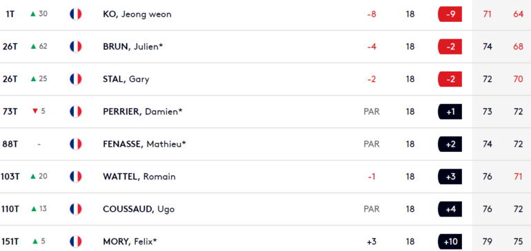 Auteurs respectivement d’un 68 (-4) et d’un 70 (-2), Julien Brun et Gary Stal prennent la 26e place à -2 (142). Avec deux cartes de 73 (+1) et 72 (par), Damien Perrier échoue à un coup d’un cut fixé dans le par total. 88e à +2 (146), Mathieu Fenasse ne sera pas là ce week-end, tout comme Romain Wattel, 103e à +3 (147). Ugo Coussaud, 110 à +4 (148), et Félix Mory , 151e à +10 (154), ferment la marche…