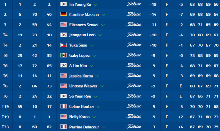 Troisième après le premier tour et encore dans le top 10 à mi-tournoi, Perrine Delacour se contente finalement de la 33e place finale après une dernière carte décevante de 75 et un score final de -3. C’est Céline Boutier qui termine meilleure tricolore avec une dernière carte de 68 pour finir dans le top 20 aux côtés notamment de la numéro un mondiale, Nelly Korda, grâce à un ultime birdie au 18 (19e, -5).