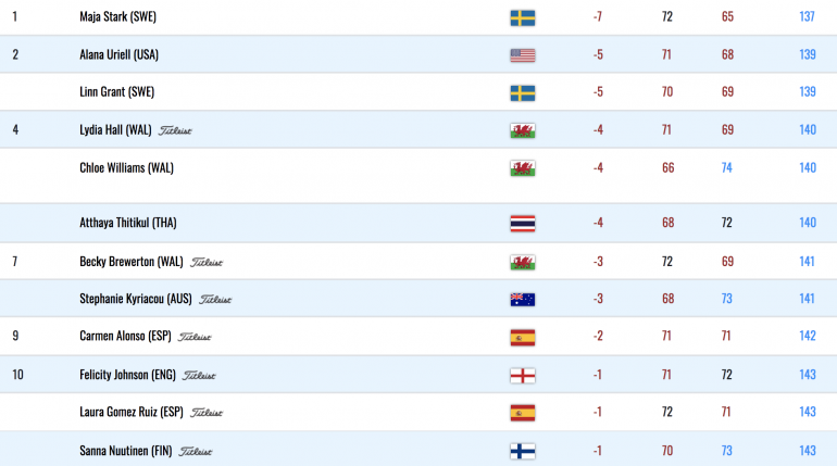 Après sa première carte dans le par, Maja Stark a rendu une excellente deuxième carte de 65 (-7). Malgré un bogey au 16, la Suédoise a enquillé huit birdies, dont six sur son l’aller. Elle compte deux coups d’avance sur sa compatriote Linn Grant (70-69) et l’Américaine Alana Uriell (71-68).