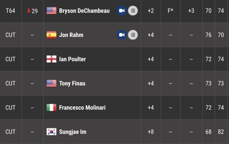 Chez les éliminés de marque à noter que Jon Rahm a mis fin à sa série de 22 cuts consécutifs sur le PGA TOUR. Le jeune papa a rectifié le tir après son 76 de la veille mais son 70 vendredi le laisse sur le carreau tout comme Patrick Cantlay, Will Zalatoris, Tony Finau et Rickie Fowler.