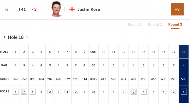 A l’image du contingent européen, Justin Rose a rendu une carte un peu terne de 73 (+1) qui le place dans le ventre mou du classement. Mais l’Anglais ne s’est pas ennuyé : il a enregistré seulement quatre pars, décorés par un triple bogey, un double bogey, quatre bogeys et huit birdies, ce qui en soit constitue un petit exploit. Merci pour le spectacle Justin !