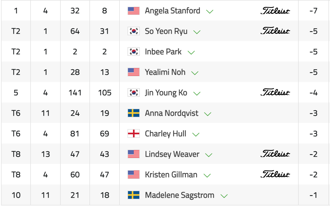 La Texane Angela Stanford a emporté le Volonteers of America Classic qui se jouait chez elle au Texas, à Colony. Elle devance trois Coréennes, une autre Américaine, deux Suédoises et une Anglaise.