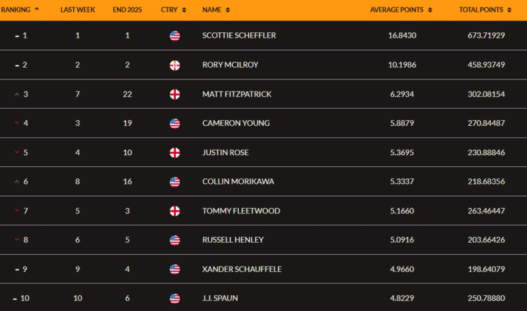 Septième lundi dernier, Matthew Fitzpatrick gagne quatre places au classement mondial du 19 avril grâce à sa victoire en play-off au RBC Heritage face à Scottie Scheffler. Jamais l’Anglais n’avait attient un tel rang. Il déloge du même coup Cameron Young, désormais 4e. L’Américain devance un autre sujet britannique, Justin Rose (5e, -1). 4e à Harbour Town, Collin Morikawa, visiblement très bien remis de son dos (il avait abandonné au Players Championship), accroche la 6e place (+2). Suivent Tommy Fleetwood (7e, -2) et Russell Henley (8e, -2).