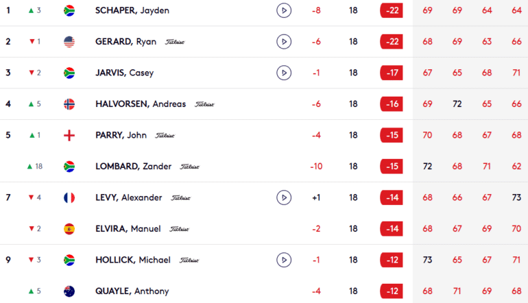 Parti avec deux coups de retard sur le duo Gerard-Jarvis, co-leaders à -16 après 54 trous, Jayden Schaper a rapidement mis la pression tout en haut du leaderboard en trois trous seulement (du 3 au 5) avec deux birdies et un eagle. Sans perdre espoir malgré l’avance de deux coups prise par ce même Ryan Gerard en attaquant les neuf trous du retour, le natif de Benoni, dans la proche banlieue de Johannesburg, s’est offert un rush final de très grande classe, claquant trois birdies du 15 au 18 et provoquant du même coup un playoff à -22 grâce à une énorme carte de 64 (-8) sans bogey avec le joueur du PGA Tour, lui aussi solide avec son 66 (-6) immaculé bouclé par un magnifique birdie tout sauf fait sur le green du 18.