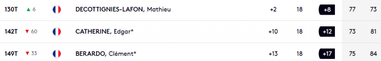 Neuf rangs de gagnés pour Félix Mory avec son 68 (-3) du jour. Le Nordiste installé à Munich entre dans le top 10, à la neuvième place à -5 (137). Plus loin, on retrouve Paul Margolis (20e à -3) puis Gary Stal (25e à -2). Robin Sciot-Siegrist, Adrien Saddier, Victor Riu et Ugo Coussaud sont au-delà du top 30 (33es à -1) tandis que Clément Sordet ferme la marche dans le par total (48e). Il y aura donc neuf tricolores ce week-end en Italie !