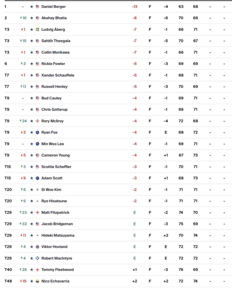 En tête Daniel Berger continue de dominer son sujet et a rendu vendredi une très solide carte de 68, concédant son premier bogey du tournoi au 8, son 25e trou du tournoi. A -13 total son avance est de 5 coups son premier poursuivant. Le record d’écart après 36 trous dans ce rendez-vous historique du PGA Tour de 7 coups (Adam Scott 2014) n’a donc pas était battu.