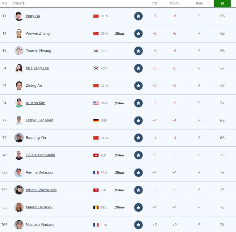 Bien aidée par son eagle sur le par 4 du 15, l’Allemande Esther Henseleit (7e) est la seule Européenne du top 10 après le premier des quatre tours sur le Jian Lake Blue Bay Golf Course. Perrine Delacour et Nastasia Nadaud, les deux seules Françaises engagées (qui débutent cette semaine toutes les deux leur saison américaine) sont plus loin, au-delà du top 50. La joueuse du Golf Club d’Aix-les-Bains était pourtant bien partie avec un aller bien maîtrisé en -2 (trois birdies et un bogey), mais ses quatre bogeys sans étincelle sur le retour font plonger la Chambérienne à +2.