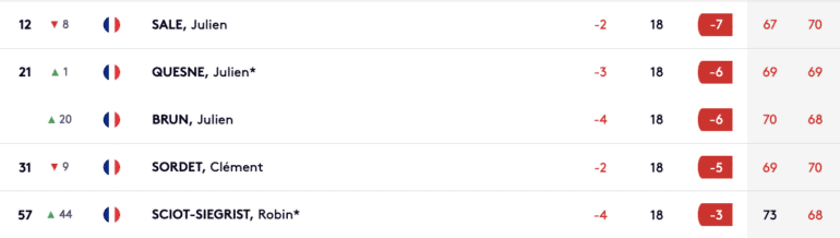 Parmi les joueurs toujours dans le coup, on retrouve un autre Bleu, Julien Sale (12e). Le vainqueur sur l’Asian Tour l’an dernier est à quatre unités de son compatriote après des scores de 67 (-5) et 70 (-2). Julien Quesne et Julien Brun (21es) sont aux portes du top 20, à un coup derrière Sale.