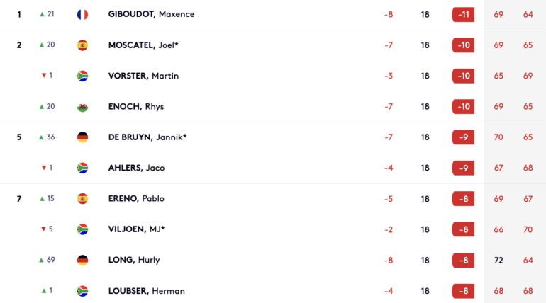 L’Espagnol Joel Moscatel, le Gallois Rhys Enoch, tous deux auteurs d’un 65 (-7) lors de ce deuxième tour, et le local Martin Vorster ne sont qu’à une longueur du Français. Le haut du classement reste très serré, une vingtaine de joueurs sont à quatre coups ou moins du leader.