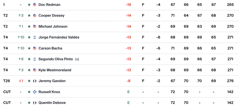 Doc Redman est un miraculé. Il avait officiellement perdu son statut sur ce circuit l’an dernier après avoir pris la 138e place au classement général. Il avait pu se qualifier pour le Sanderson Farms sur le PGA Tour quelques semaines plus tard grâce à un Monday Qualifier. Le golfeur originaire de Caroline du Nord y avait pris la neuvième place avant d’enregistrer deux autres tops 20 là aussi sur le PGA Tour. Ces résultats lui avaient redonné un statut sur le Korn Ferry Tour.