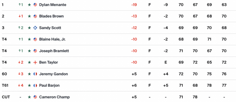 Pour empocher, à 24 ans, son premier titre sur le Korn Ferry Tour, Dylan Menante a fait les choses avec la manière. Deuxième avant le dernier tour, le natif du Nevada a en effet empoché la mise sur le PGA Riviera Maya grâce à une dernière carte de 63 (-9). C’est de très loin le meilleur score du jour, on retrouve seulement un 67 (-5) et un 68 (-4) derrière lui.