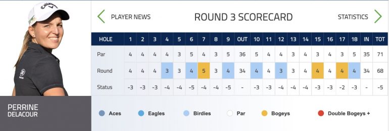 C’est désormais Perrine Delacour qui mène la danse chez les Françaises à la 41e place. Qualifiée in-extremis après que le deuxième tour se soit achevé le matin, la joueuse de l’Aisne a rendu une carte sous le par samedi ponctuée de six birdies et trois bogeys.