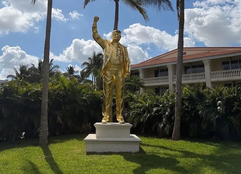 Elle trône en évidence dans le complexe hôtelier du Trump National Doral, non loin du practice où les joueurs engagés cette semaine au Cadillac Championship, 5e Signature Event de la saison, s’entraînent assidument. Une statue de bronze haute de 4,57 mètres (6,71 mètres avec son piédestal) recouverte de feuilles d’or représentant l’actuel locataire de la Maison-Blanche, le poing dressé. Les statues gigantesques de l’ère soviétique à l’effigie de Lenine n’auraient pas fait mieux.