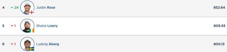 Vainqueur et désormais 6e joueur de l’histoire à accomplir le Grand Chelem en carrière, Rory McIlroy caracole en tête de ce classement avec 2 863,75 pts, loin devant l’Anglais Tyrrell Hatton, 990,55 pts.