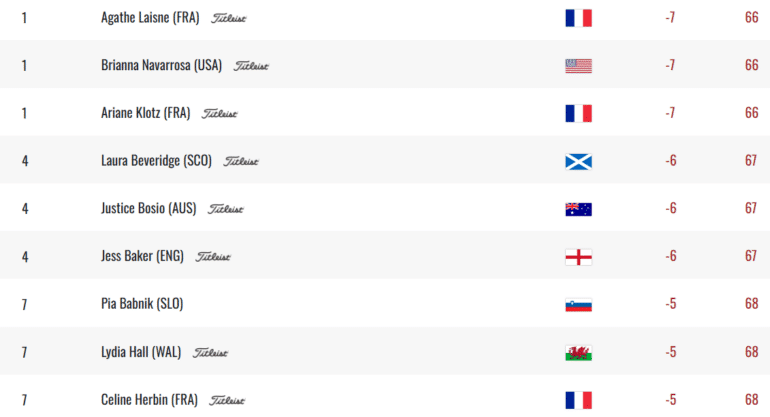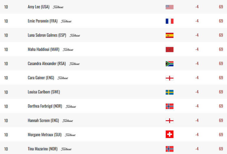 Bon départ également pour Emie Peronnin avec son 69 (-4), elle qui n’avait pas franchi le cut de ce tournoi l’an passé. Les Françaises, on l’a dit, qui semblent plutôt en forme puisque Camille Chevalier, Emma Falcher et Chloe Salort débutent par un très encourageant 70 (-3) et une non moins très intéressante 21e place au leaderboard.