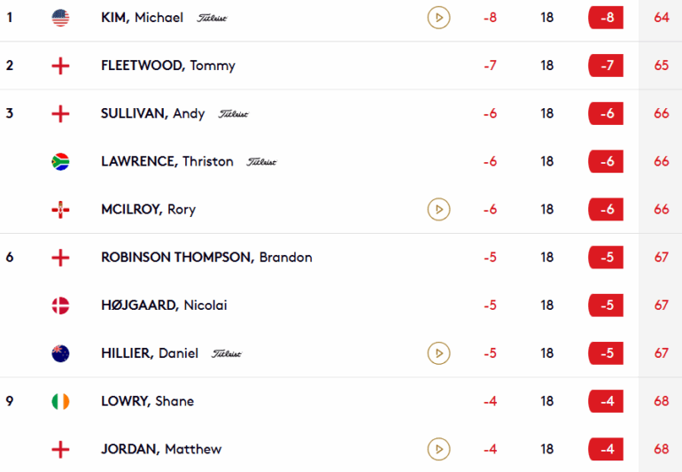 Convoqué en dernière partie à 12h40 locale (9h40 en France), Rory McIlroy a lui aussi démarré pied au plancher ce tournoi qu’il a remporté déjà à trois reprises (2012, 15 et 24). Associé à Marco Penge, le Nord-Irlandais a rapidement pris l’ascendant sur l’Anglais avec trois birdies réussis sur ses trois premiers trous avant de partir à la faute (la seule fois de la journée) au 4. Très solide avec ses fers mais aussi putter en mains sur un parcours qu’il connait par cœur, Rory McIloy a ajouté quatre autres birdies entre le 7 et le 14 pour se caler en troisième position à -6 (66) en compagnie d’Andy Sullivan et Thriston Lawrence.