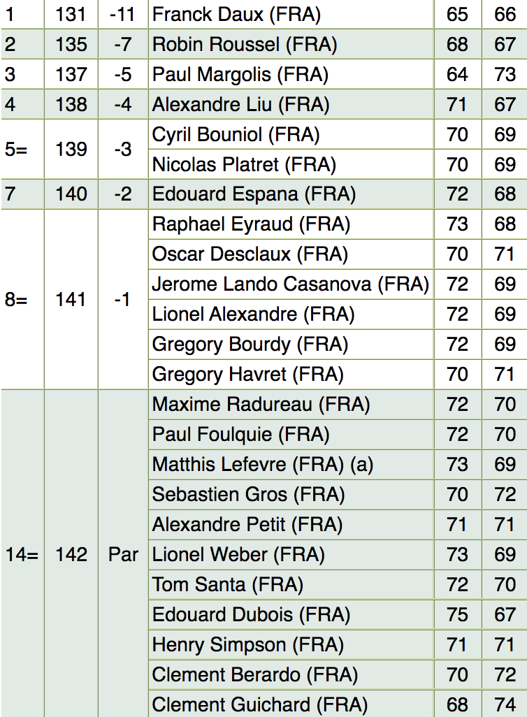 Parmi les 43 joueurs à passer le cut, on compte un des trois amateurs engagés. Matthis Lefevre (par, 14e) est même dans le top 15 provisoire.