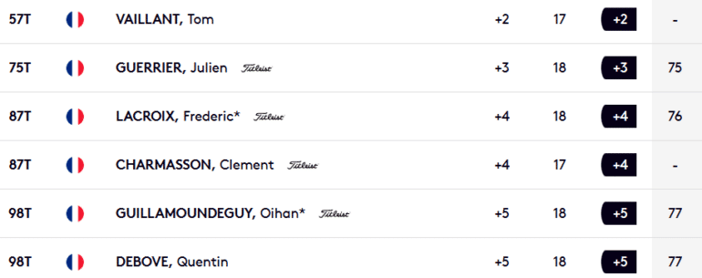 Bonne entame également pour Ugo Coussaud (top 20 au Hainan Classic) qui poste un encourageant 71 (-1). Il est 17e après un tour. A noter que Tom Vaillant et Clément Charmasson (associés à l’Indien Mod Azhar) ont été les seuls ne pas pouvoir signer leur carte en raison du manque de visibilité. Après 17 trous, ils affichaient respectivement un score de +2 et +4. Ils finiront à partir de 7h35 (3h05 en France) avant d’embrayer sur le 2e tour !
