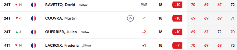 Ugo Coussaud aurait lui aussi pu s’inviter à la fête. Deuxième à -16 à trois trous de la fin, son bogey du 17, après n’avoir pu faire mieux qu’un par sur le par 5 du 14, a été l’erreur de trop. Malgré un très solide 67 (-5) final, l’Angoumoisin se contente seul de la 6e place à -15 (273). C’est son premier top 10 depuis cette 5e place le 12 octobre 2025 à l’Open d’Espagne. C’est surtout le meilleur résultat du contingent tricolore cette semaine au Royaume du Bahreïn puisque l’on retrouve ensuite David Ravetto, Martin Couvra et Julien Guerrier en 24e position à -10 (278).