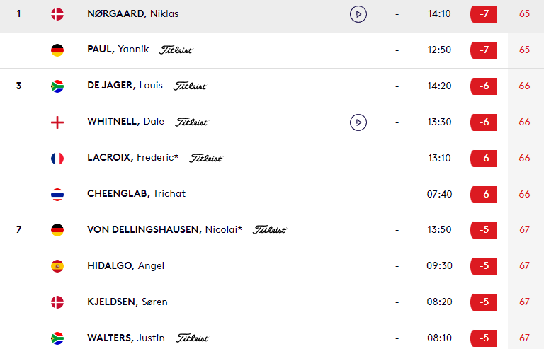 Lacroix a très bien joué lors de ce 1er tour, ne cédant qu’un seul coup au Danois Niklas Norgaard et à l’Allemand Yannik Paul, coleaders à -7. Un Norgaard très en forme, alors qu’il s’était blessé au dos lundi en faisant du ski nautique…