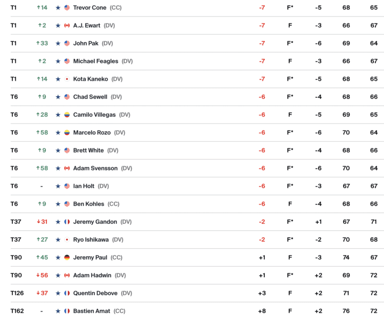 Mais il reste 36 trous à jouer et bien des émotions à gérer pour tous les joueurs en lice. A la sixième place figurent deux anciens vainqueurs sur le PGA Tour. Camilo Villegas, 43 ans, cinq fois lauréat dont une dernière à émotions il y a deux ans, et Adam Svensson, sacré sur le RSM Classic en 2022, sont pour l’instant hors des clous. Pour l’instant.