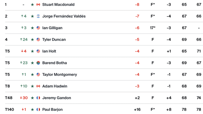 Le Canadien Stuart Macdonald (31 ans) mène le bal avec un score de -8. Son 67 du deuxième tour est peut-être plus impressionnant que son 65 initial, car les rafales ont soufflé fort vendredi. Il devance d’un coup l’Argentin Jorge Fernández Valdés (-7). L’Américain Ian Gilligan (-6) est à leur trousses avec un trou à jouer.