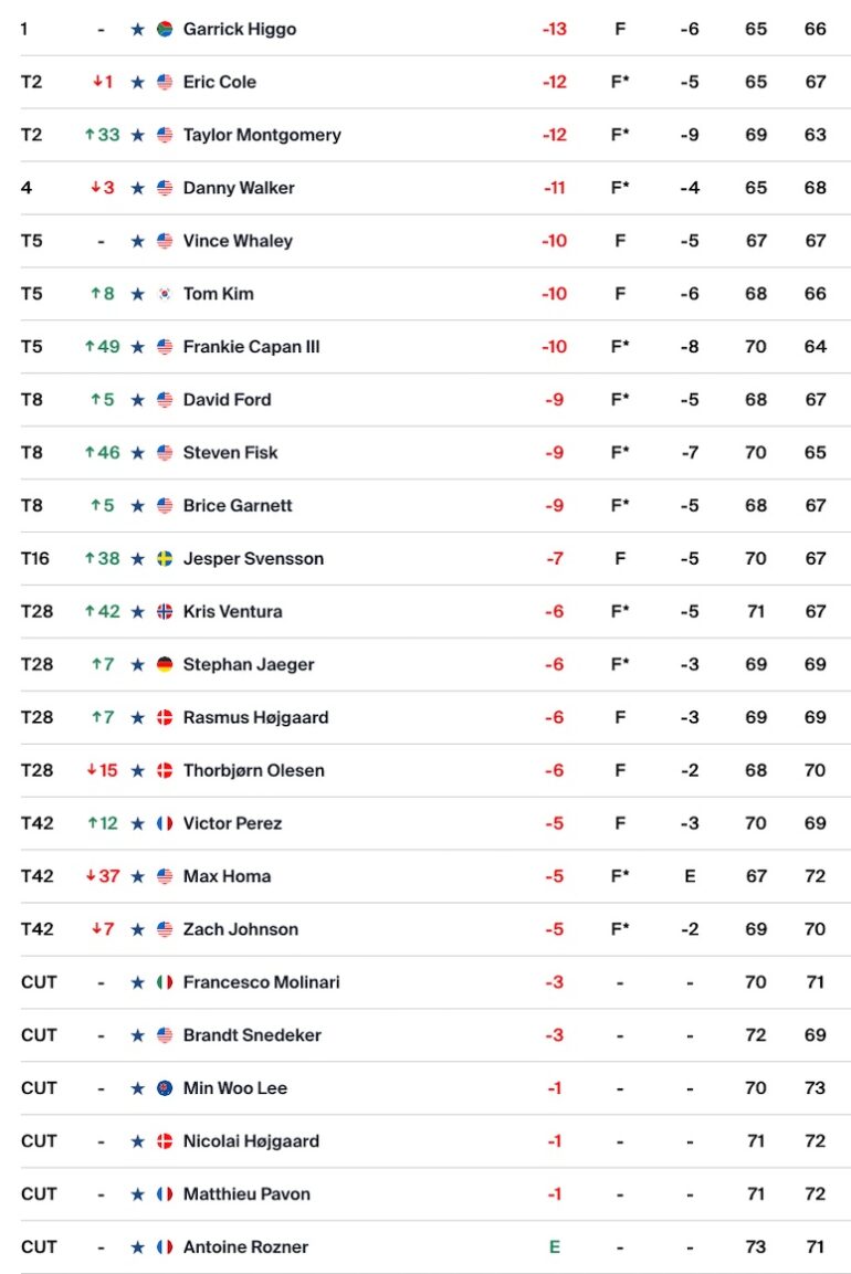 Après avoir signé une carte de 66 (-6) sur le parcours de The Country Club of Jackson, Garrick Higgo devance d’un coup Eric Cole et Taylor Montgomery. Ce dernier a signé neuf birdies en dix trous et bouclé sa partie en rentrant un putt de 7 mètres 50 pour un tonitruant 63 – boostant ainsi ses chances de conserver sa carte PGA Tour l’an prochain.