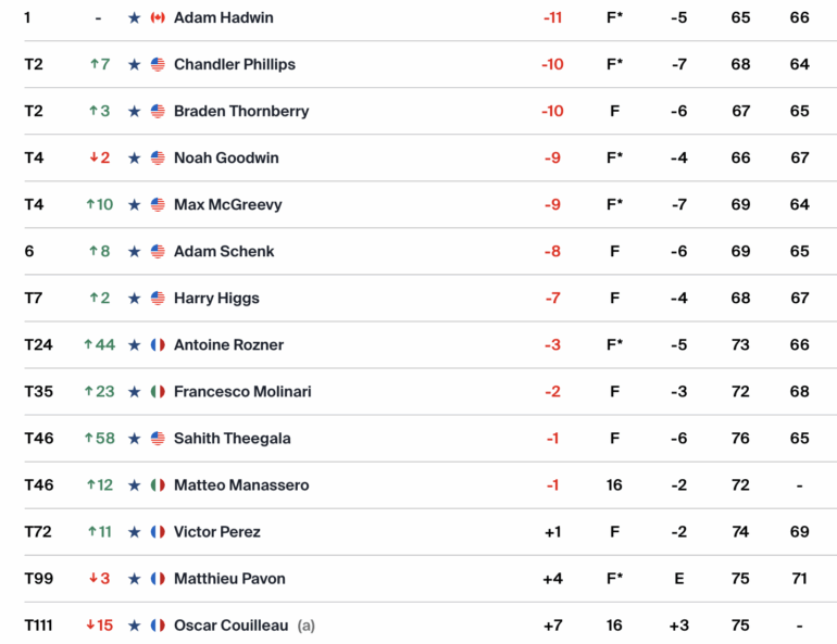 Lui aussi dans les parties du matin, le leader de la veille, Adam Hadwin, a poursuivi sur un rythme élevé. Son 65 initial a été suivi d’un 66 encore impressionnant, et ce malgré un double bogey.