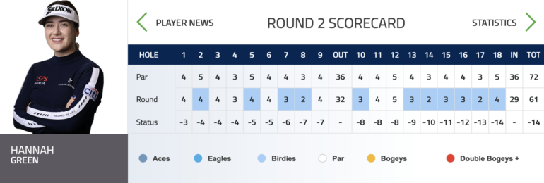 Toujours solide, Céline Boutier est parfaitement dans le coup pour la gagne avant le week-end. Elle n’est qu’à quatre coups de celle qui mène le bal dans ce Ford Championship, Hannah Green. L’Australienne a signé un phénoménal 61 avec onze birdies, dont six sur ses six derniers trous !